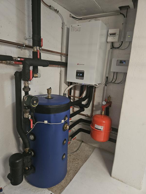 Ce projet à Épron consistait à moderniser le système de chauffage existant en remplaçant une chaudière gaz par une solution hybride plus performante. La pompe à chaleur hybride combine une pompe à chaleur air-eau avec une chaudière gaz à condensation ThemaFast Condens, offrant ainsi une flexibilité énergétique optimale.